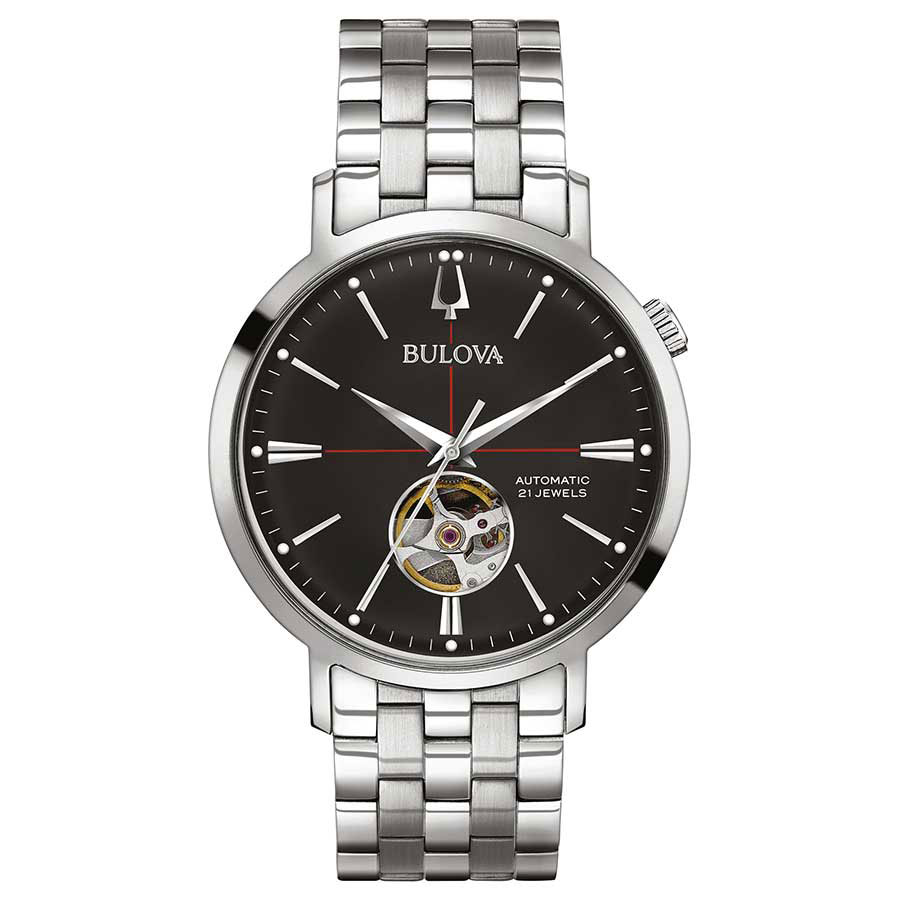 The Aerojet Automatic men's watch is a Bulova model built with a 41mm steel case and strap. It comes with a silver colored dial and a transparent porthole with visible movement. Mineral glass. The watch is powered by an automatic mechanical movement with a 40 hour power reserve.