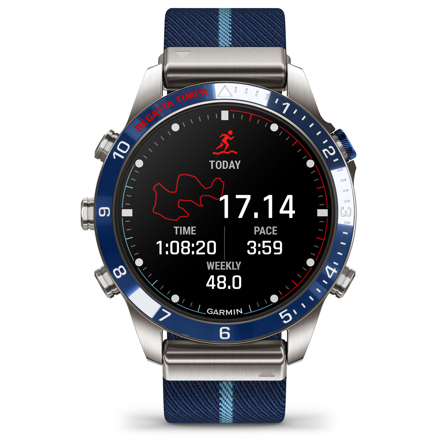 Built for living life at the helm, this luxury modern tool watch features a race-inspired striped jacquard-weave nylon strap and a stunning AMOLED touchscreen display with traditional button controls. The 46 mm case is made of Grade-5 titanium for an ultradurable design.