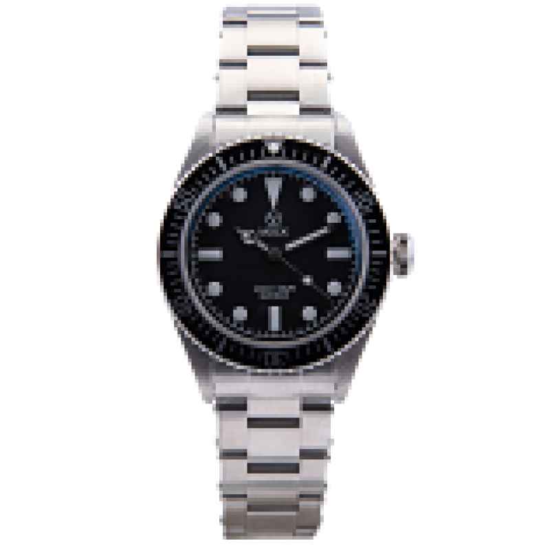 Mock watch with a sporty look, model powered by a mechanical mechanical movement that comes with a steel case and a steel strap. The black dial is protected by a sapphire crystal. Waterproof up to 10 atm.