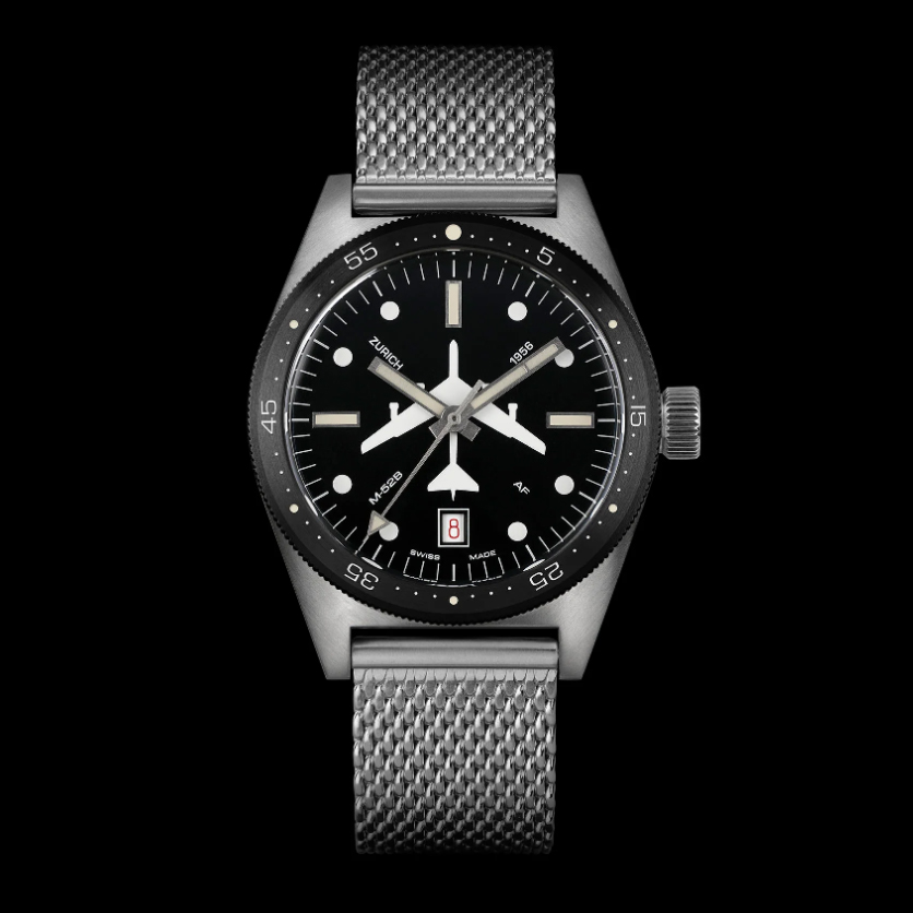 The new watch features a robust 39 mm M-type case and a PVD-coated chamfered-edge bezel, modelled on the streamlined nose cone profile of the B-52.