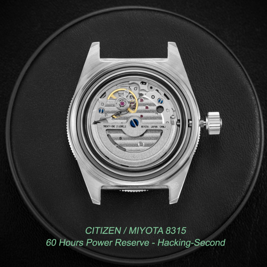 Powered by the proven Japanese Citizen/Miyota 8315 automatic movement, the watch offers a reliable power reserve of approximately 60 hours.