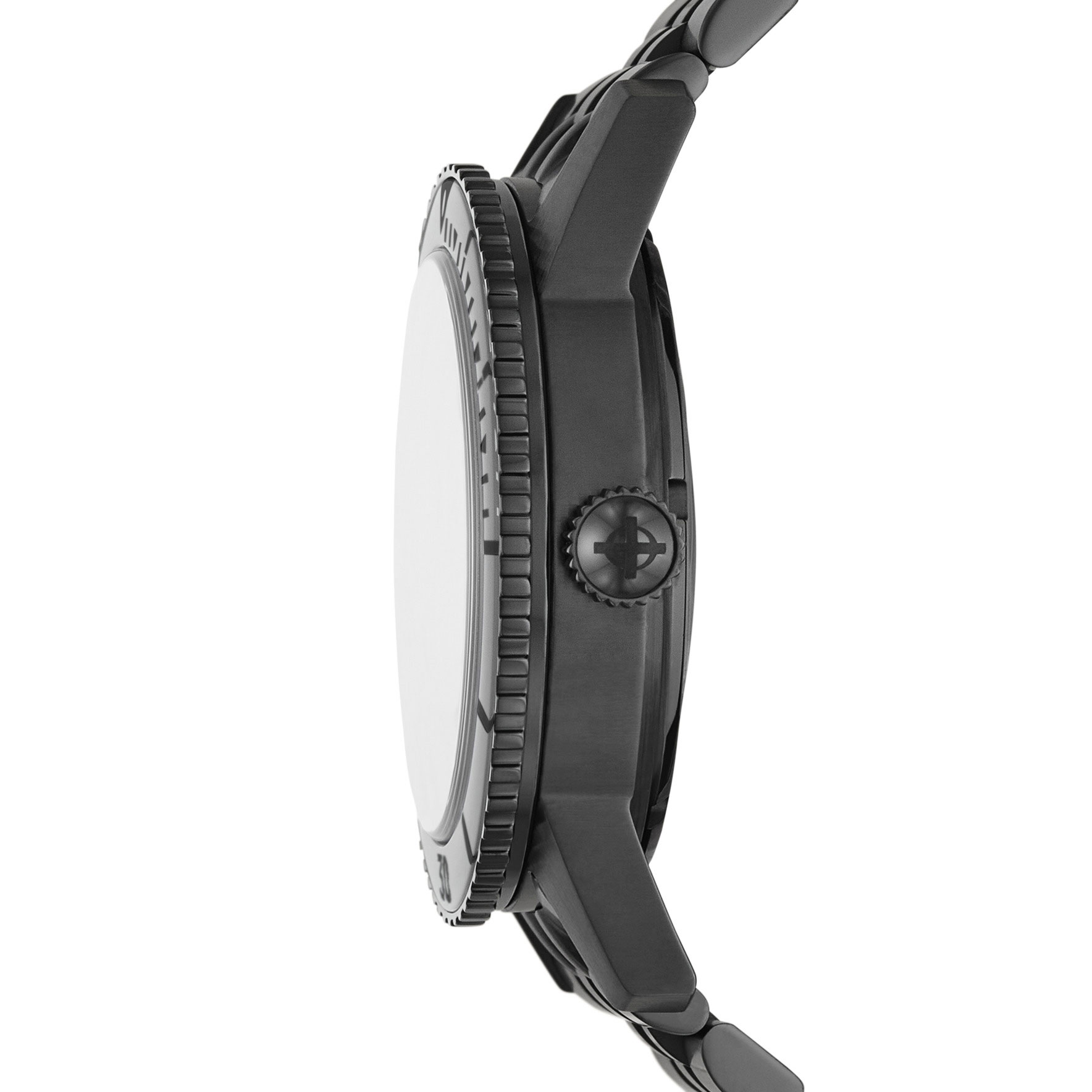 a gray brushed stainless steel five link deployment clasp bracelet. The watch is powered by a Swiss made STOP 1-11 automatic mechanical movement.