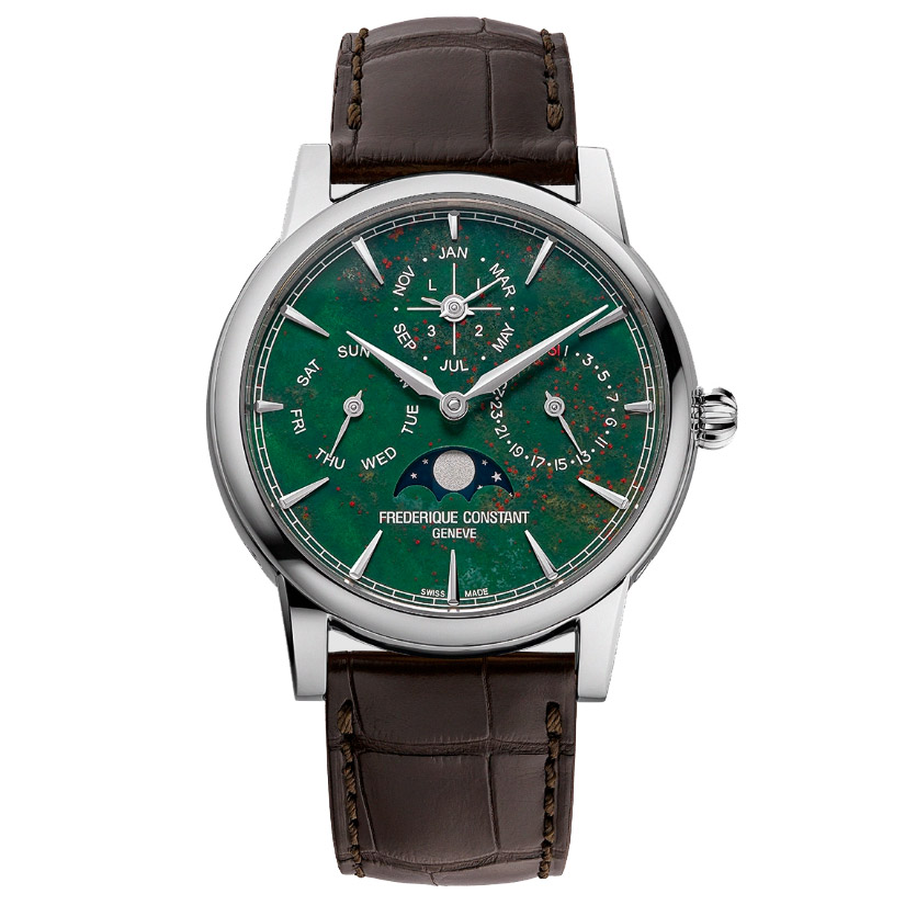 Per la prima volta, Frederique Constant utilizza il Turchese in un segnatempo di Manifattura. Le sue venature nere naturali creano un effetto marmoreo unico, incorniciando la fase lunare.