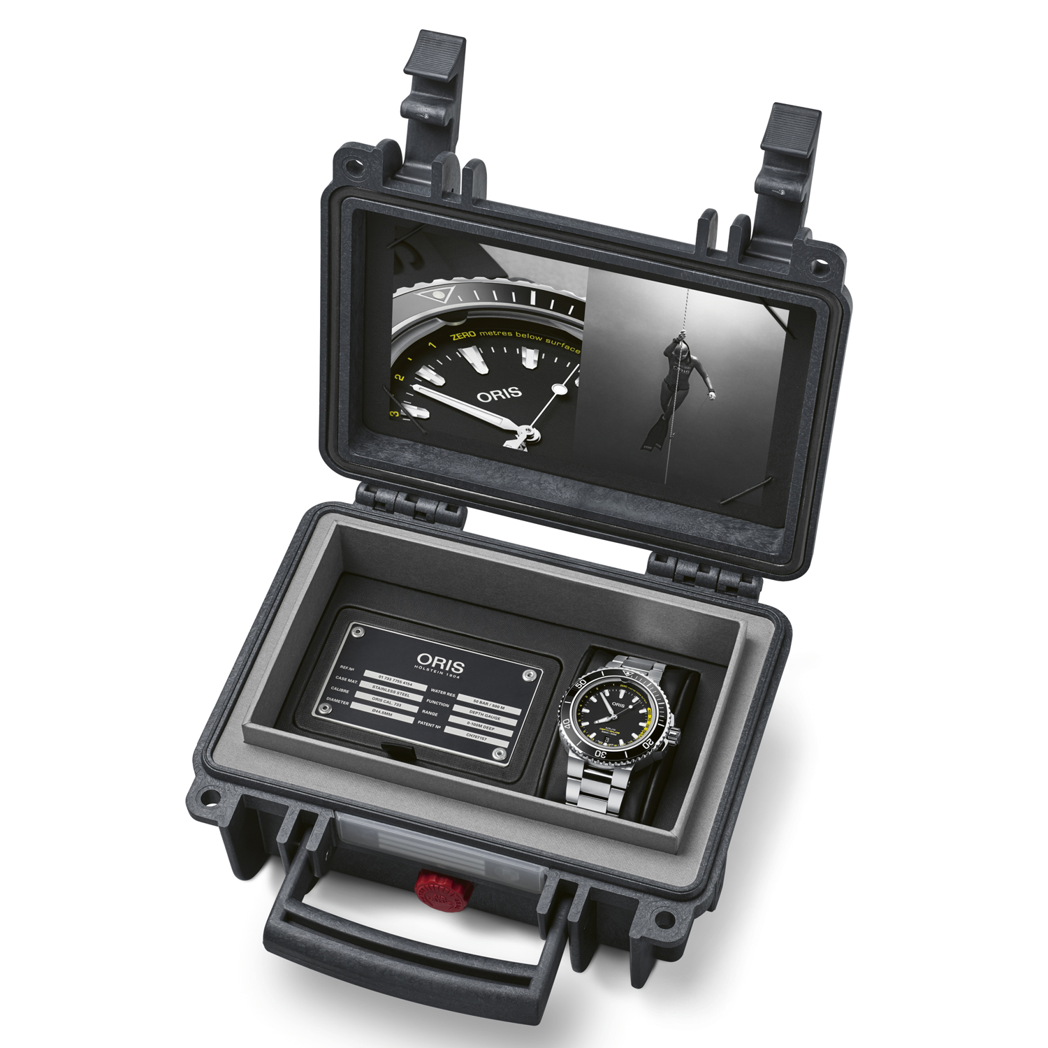 Bracelet/strap Stainless steel metal bracelet or black rubber strap, both with Oris-patented Quick Strap Change system and Oris-developed folding security clasp with extension and safety anchor systems