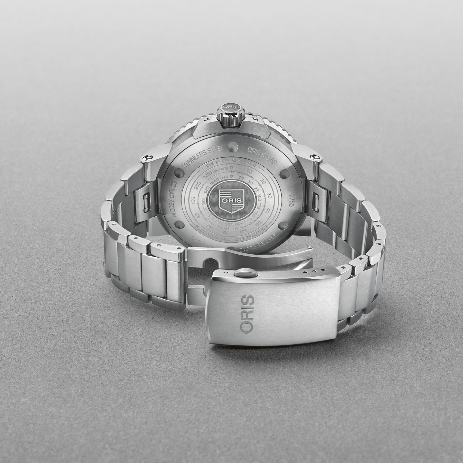 The Aquis Depth Gauge allows water into the crystal, but it doesn’t allow water into the watch itself – this would damage the watch’s automatic mechanical movement. Oris engineered the watch so that water can only enter the channel through the hole in the crystal. A gasket around the crystal seals the watch, and is so reliable that Oris has certified the watch as water-resistant to 50 bar (500 metres).