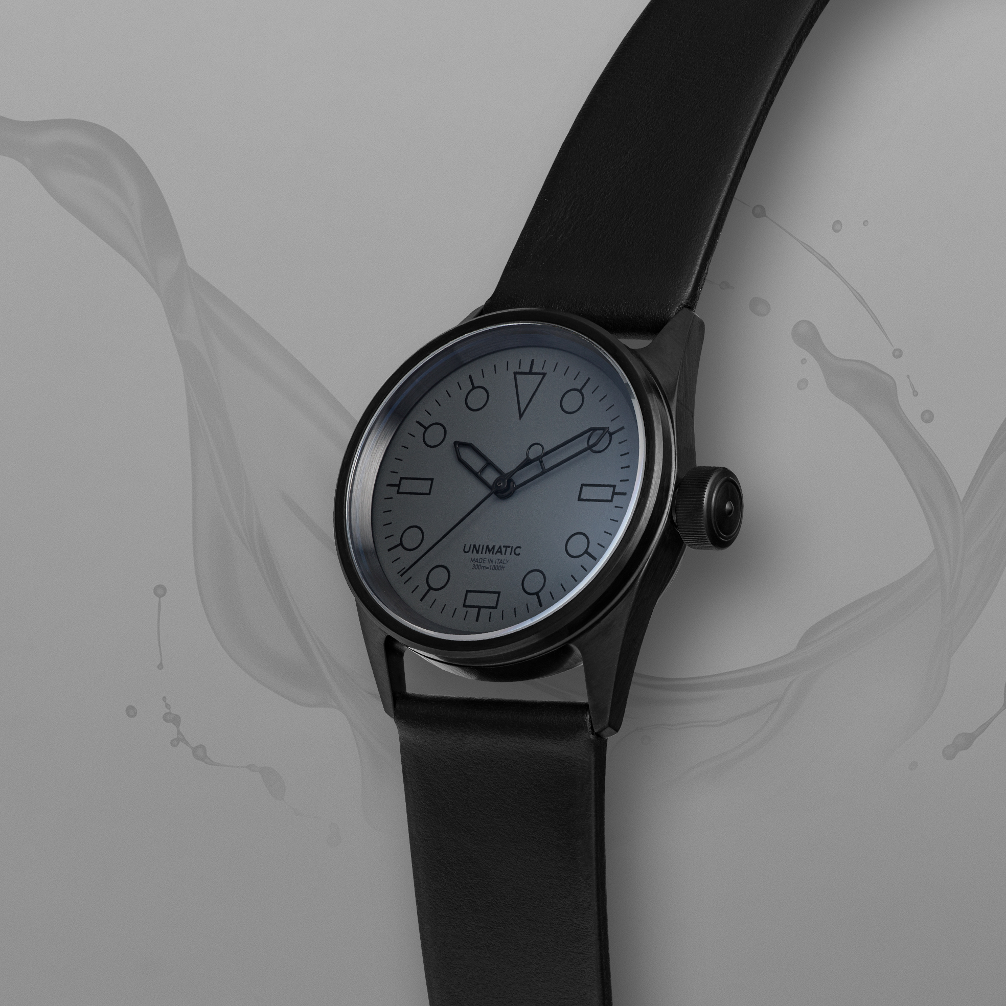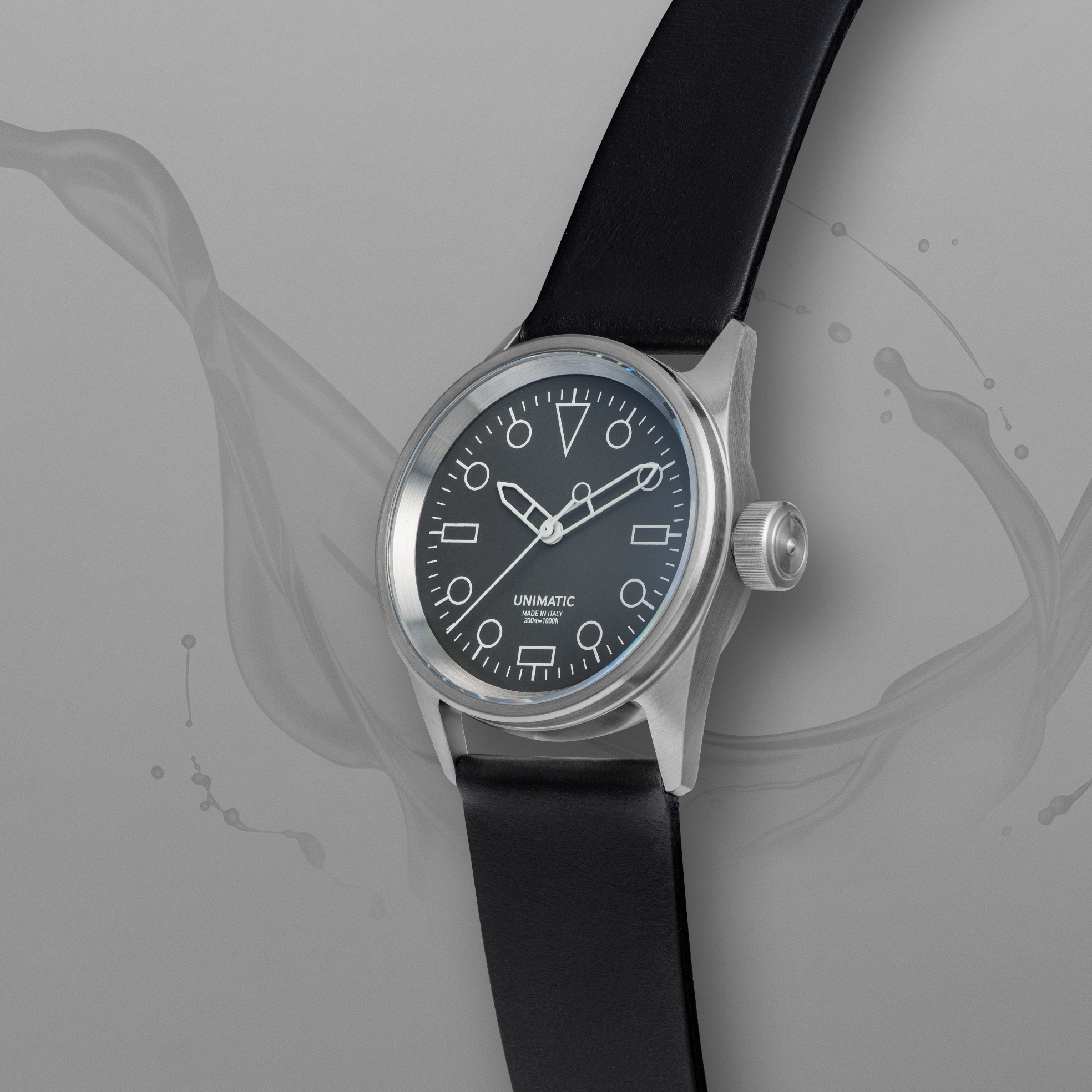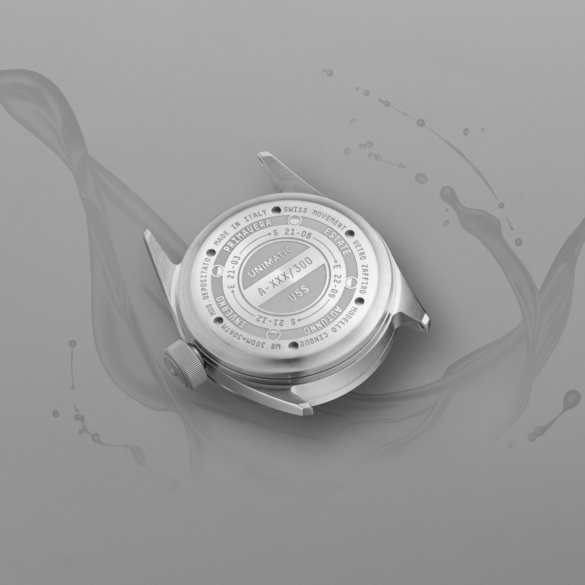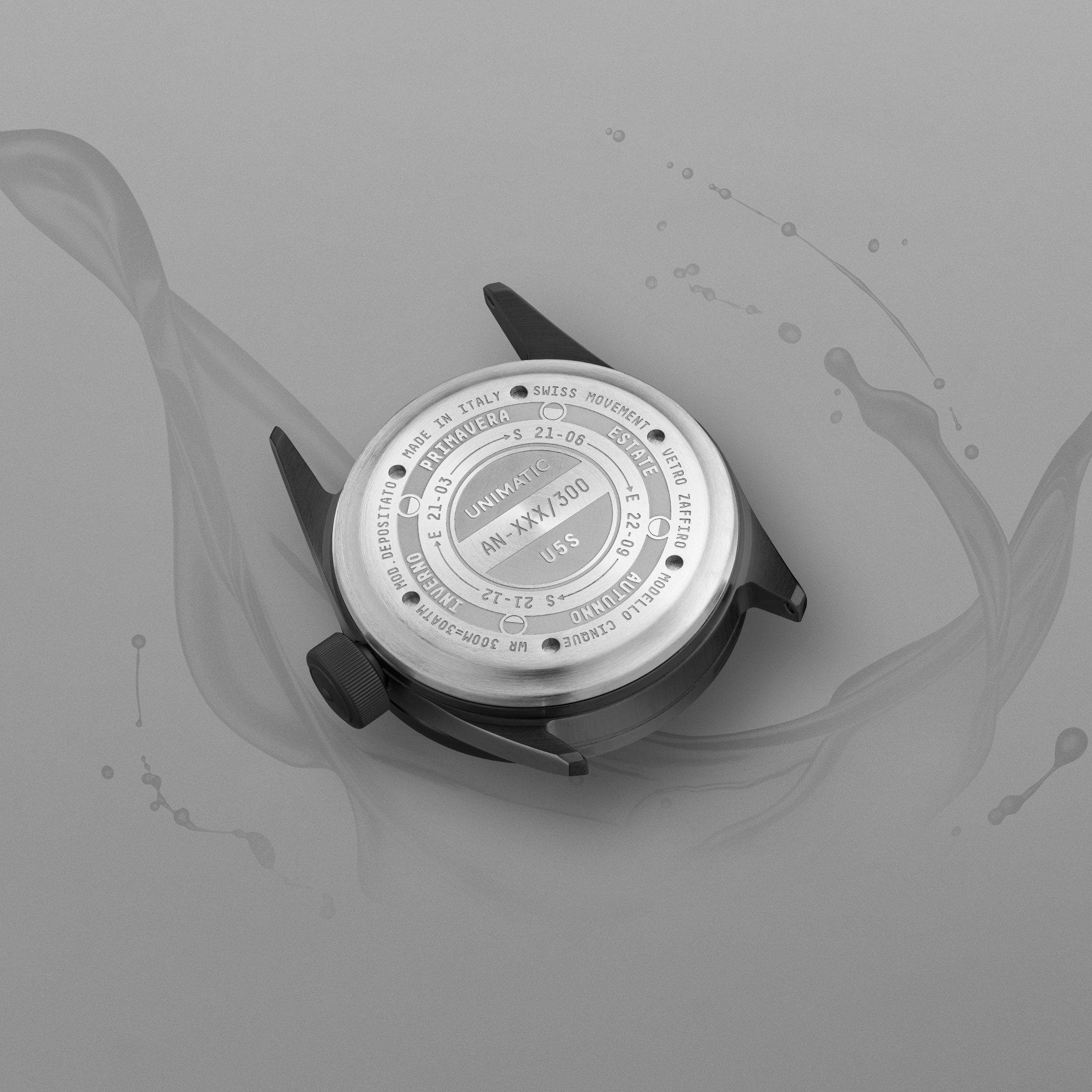 It comes on a black tapered 22-20mm quick-release two-piece TPU strap with black DLC brushed hardware signed UNIMATIC and an extra black calf leather tapered 22-18mm two-piece strap. The caseback features UNIMATIC “Quattro Stagioni” engraving and the individual progressive number.