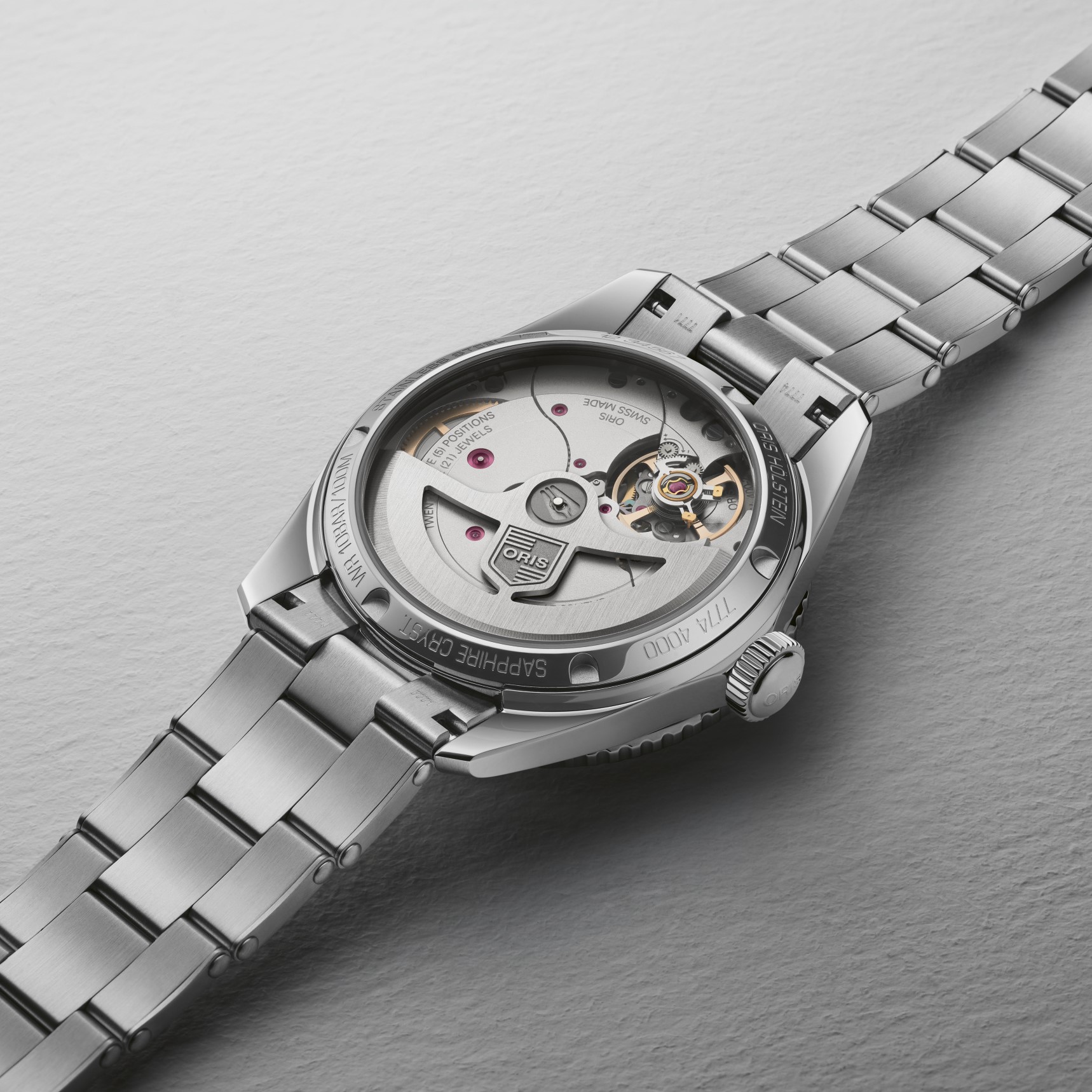 The Caliber 400 represents a significant step forward for Oris. This antimagnetic automatic movement offers a 5-day power reserve, an accuracy of -3/+5 seconds per day and recommended maintenance intervals of 10 years.