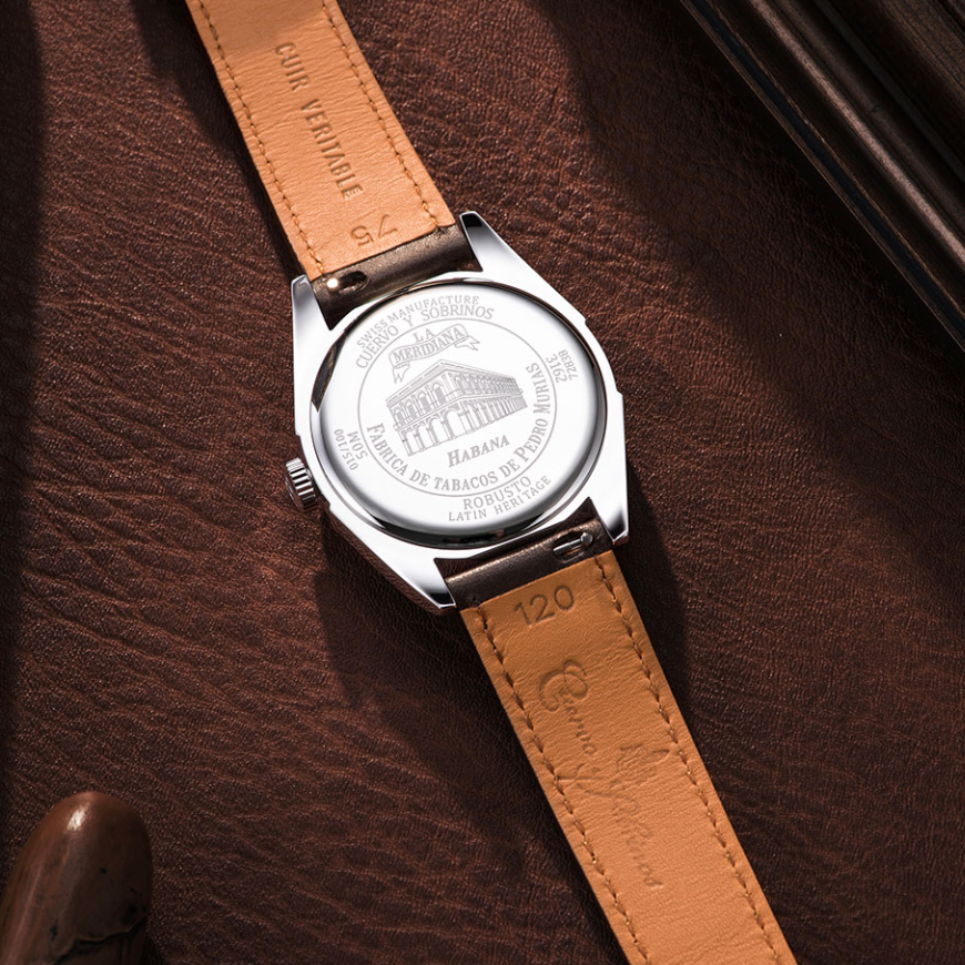 To honor this legendary cigar producer, Cuervo y Sobrinos, a brand famous for its blend of luxury and tradition, has created the Robusto Pedro Murias, a limited edition watch with only 100 pieces. This timepiece is steeped in Cuban style, featuring details inspired by the historic La Meridiana factory.