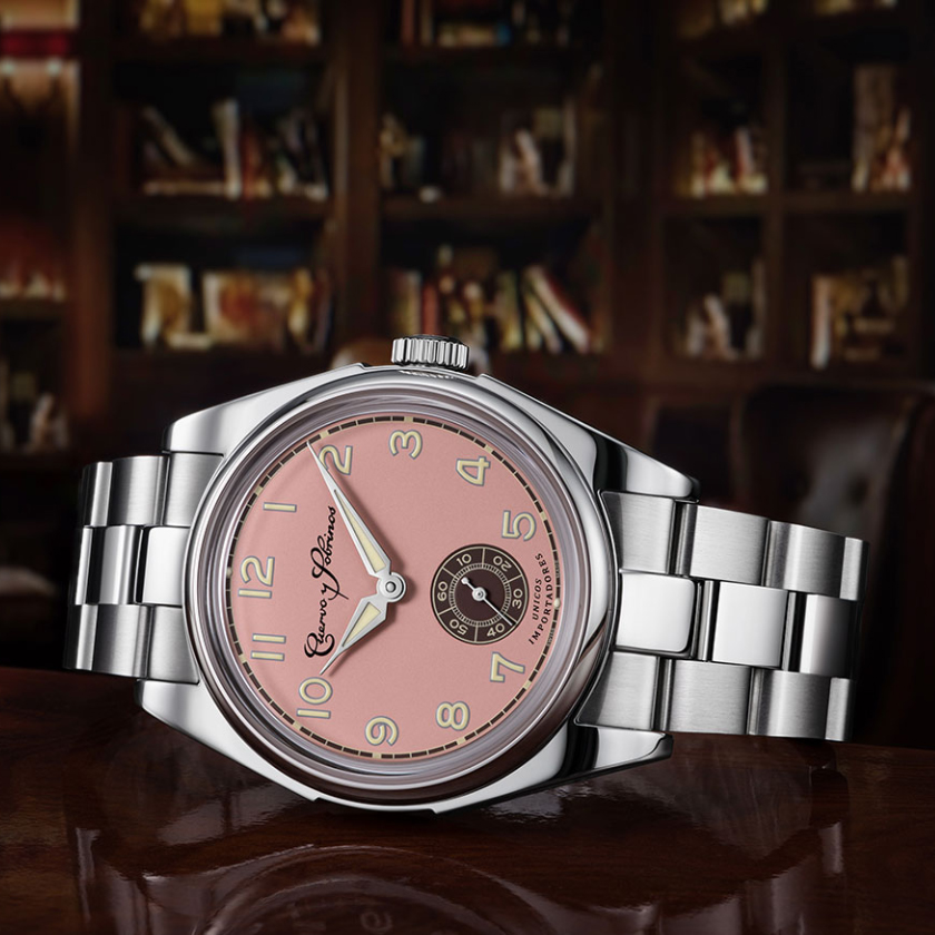 For instance, the watch's salmon-colored dial echoes the original hues of the factory walls, while the contrasting chemin de fer surrounding the dial adds an elegant touch. The large silver-toned hour and minute hands, along with the bold Arabic-style indices, are generously lined with cream-colored Super-LumiNova®, enhancing legibility in low-light conditions and giving the dial a charming vintage look.