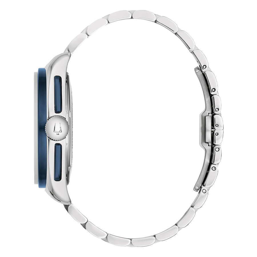 La cassa da 43,5 mm in acciaio inossidabile color argento è accentuata da sottili pulsanti del cronografo e da una corona, entrambi di un elegante colore blu, che richiamano i dettagli del quadrante. La funzionalità del cronografo a sei lancette con misurazione fino a 1/20 di secondo è garantita dal movimento proprietario al quarzo ad alta precisione di Bulova, che opera alla frequenza di 262 kHz. Questo meccanismo avanzato non solo assicura un'accuratezza senza pari, ma permette anche alla lancetta dei secondi del cronografo di scorrere con un movimento fluido e continuo, un dettaglio apprezzato dagli intenditori.