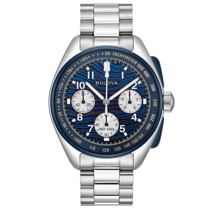 l nuovo Bulova Lunar Pilot si presenta con un design che non passa inosservato. Sotto il vetro zaffiro piatto, il quadrante Timascus cattura immediatamente lo sguardo. Questo materiale unico, realizzato in titanio piegato attraverso il processo Damascus, crea un motivo ipnotico e vibrante che rende ogni orologio un pezzo a sé stante. A completare l'estetica sofisticata, una ghiera tachimetrica blu e contatori argentati arricchiscono il quadrante, mentre gli indici e le lancette trattati con Super-LumiNova garantiscono una leggibilità perfetta anche al buio.