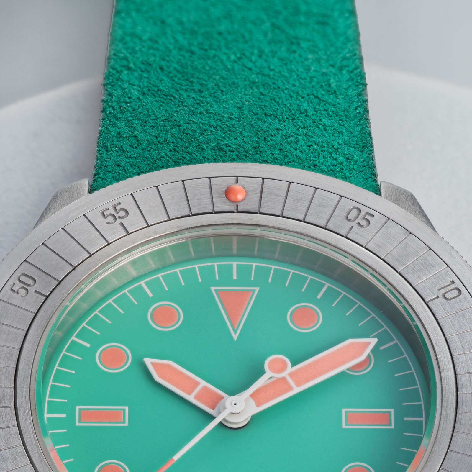 - The Dial: A fascinating verde acqua (aqua green) serves as the backdrop, enhanced by indices and hands treated with Super-LumiNova® GL Light Red, which appear as a striking pink when at rest.
