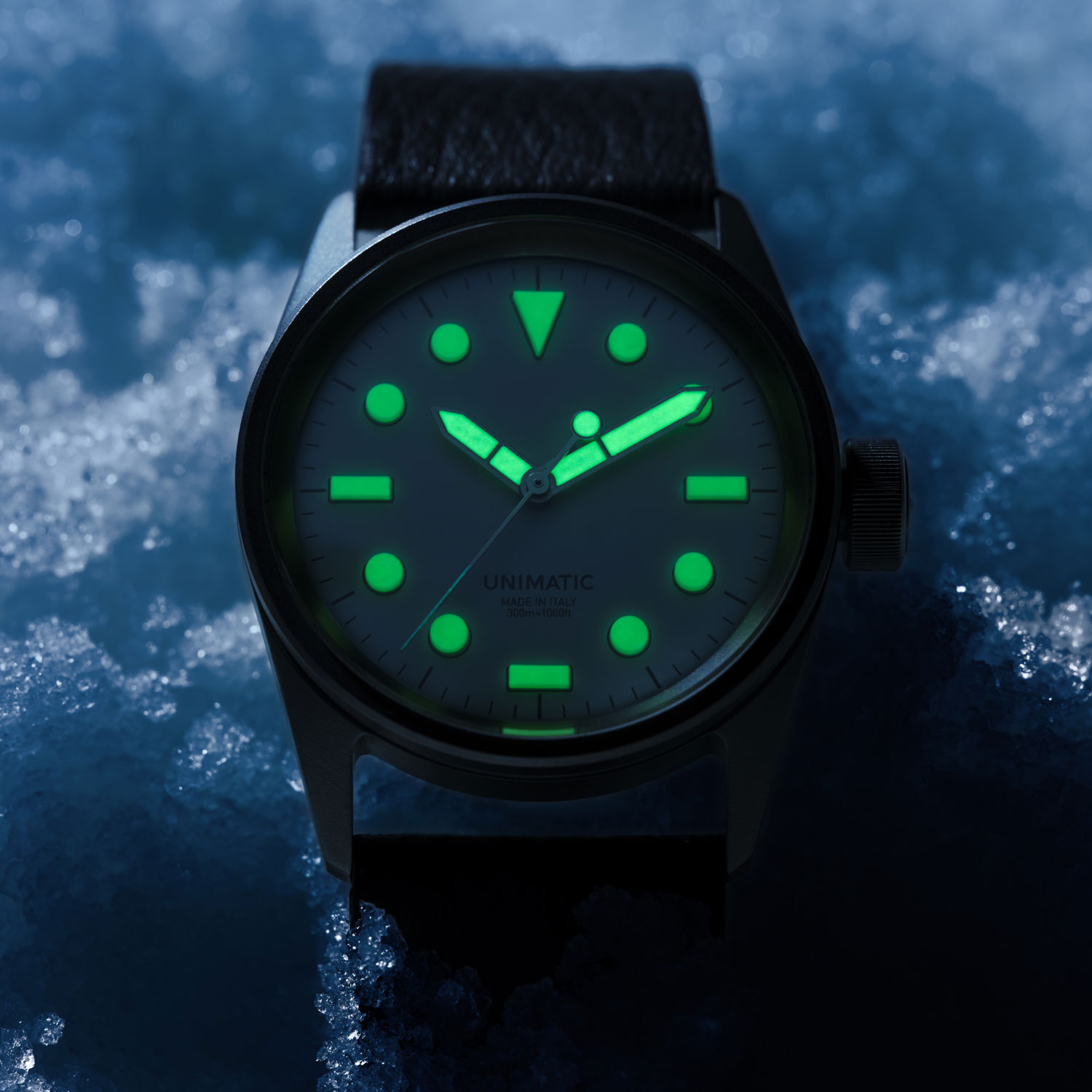 Per la prima volta, UNIMATIC introduce UNILIGHT, il suo sistema luminoso tridimensionale. Gli indici sul quadrante non sono semplicemente stampati: sono marker 3D applicati a mano, infusi con un pigmento luminescente ad alte prestazioni che si innalza fisicamente dalla superficie.