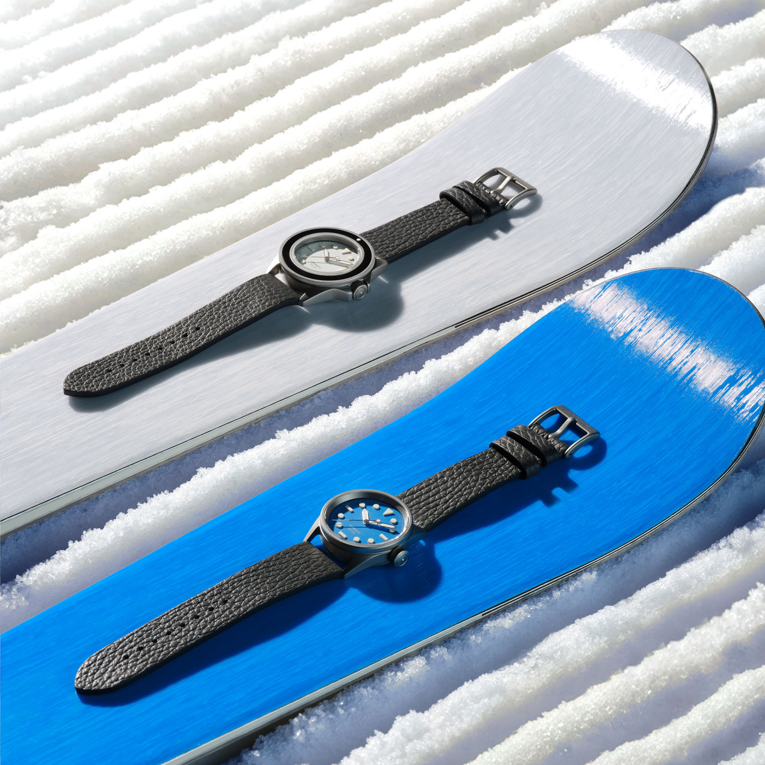 Ogni referenza è completata da un cinturino a sgancio rapido in pelle di cervo color fumo, realizzato in Italia. La pelle, riccamente strutturata, non è solo morbida e resistente, ma è destinata a evolvere con l'uso, sviluppando una patina naturale che richiama le superfici organiche delle rocce e dei sentieri montani.