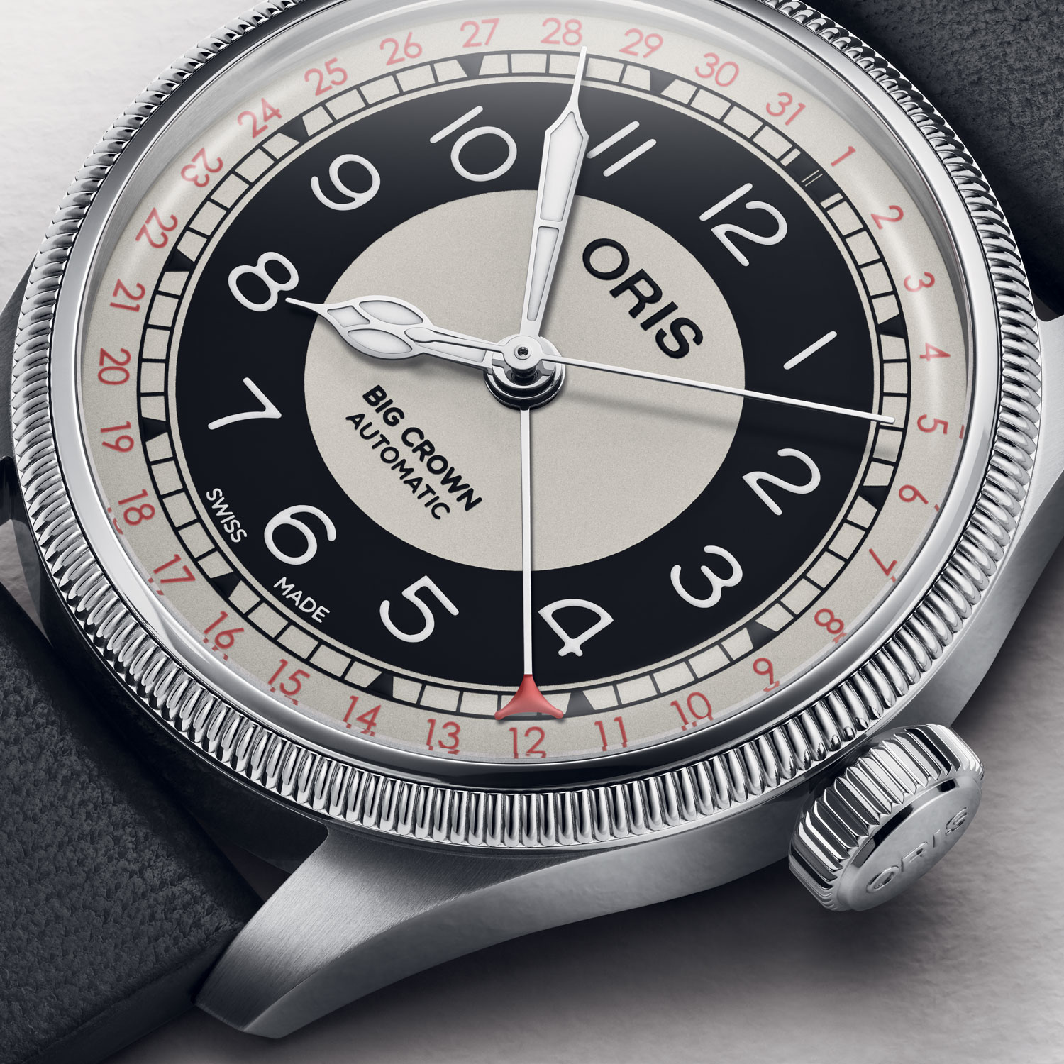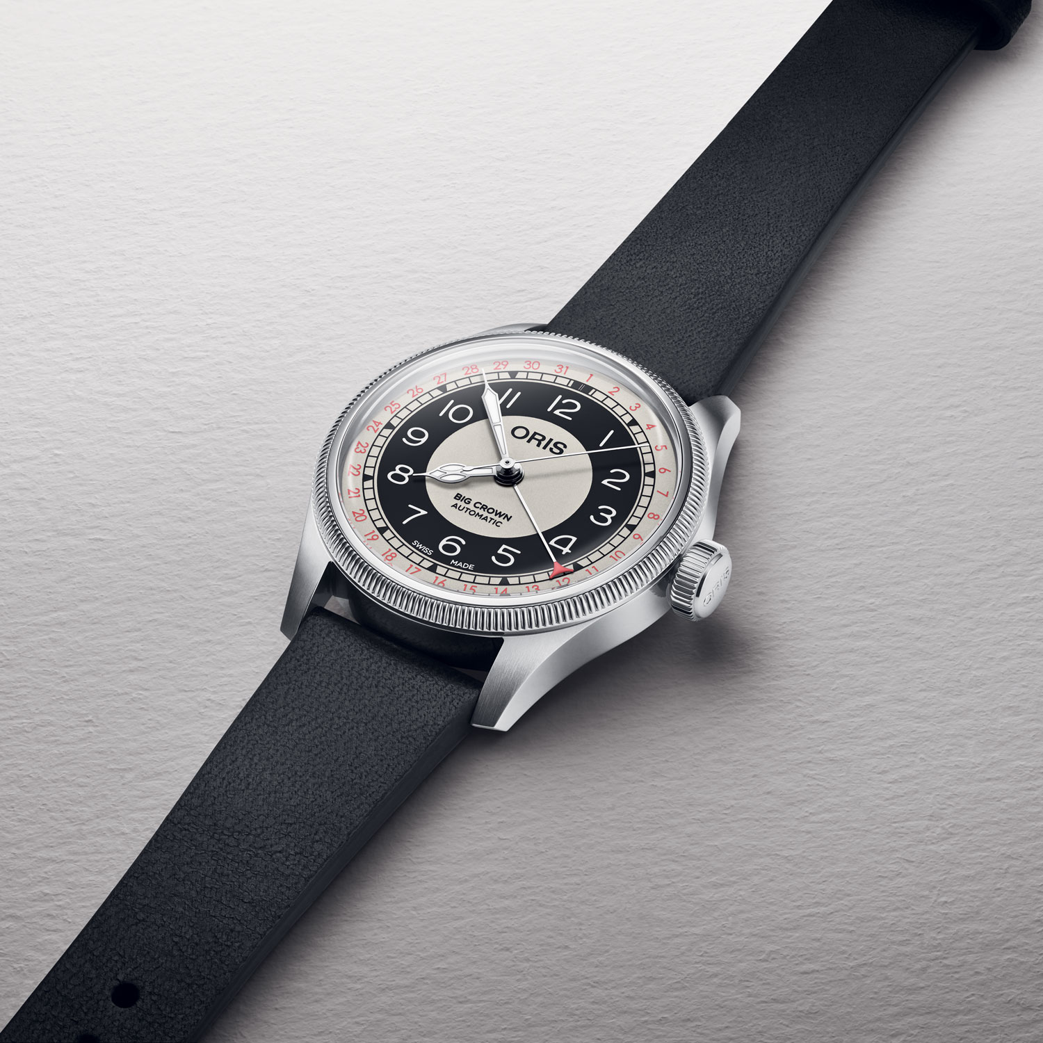 - La complicazione: al centro troviamo l’iconica data a puntatore, una funzione introdotta da Oris nel 1938 per i piloti, che permette di leggere il giorno del mese tramite una lancetta dedicata con punta rossa.