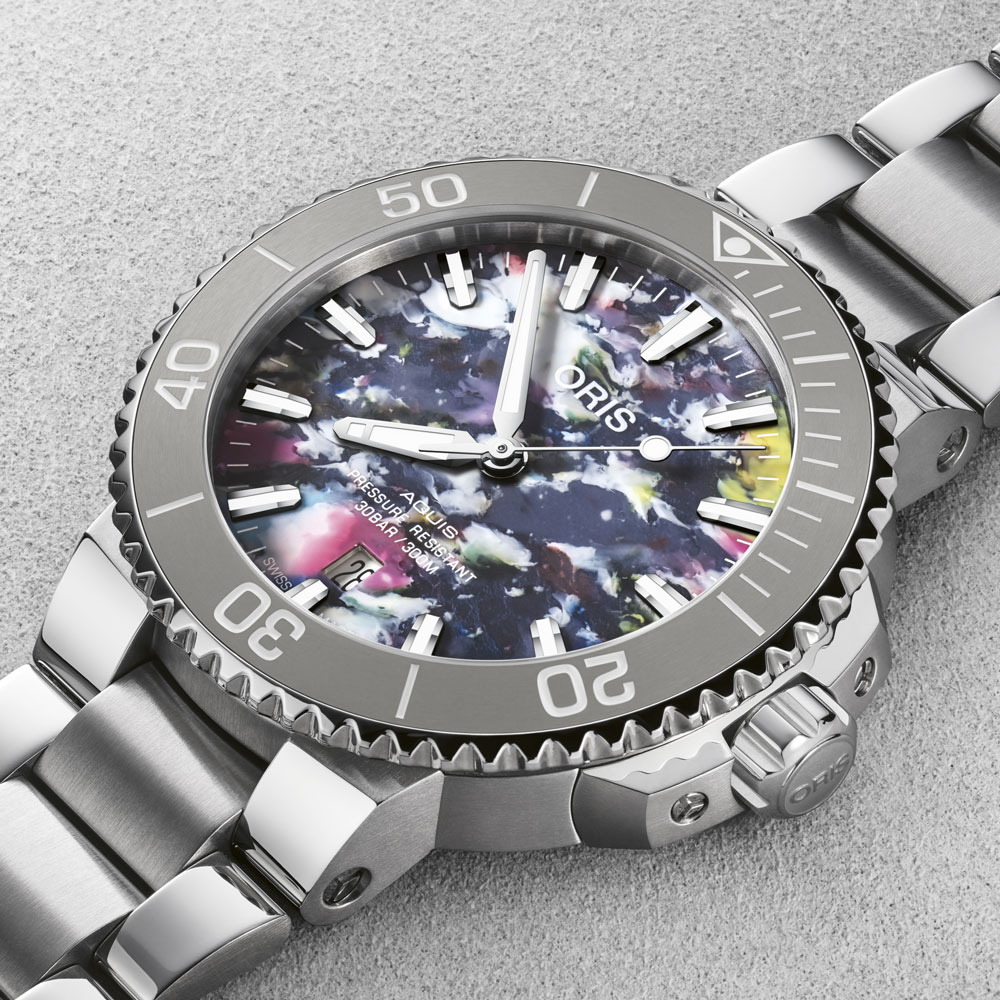 L'orologio unisex da polso Aquis Date è disponibile con una cassa in acciaio da 41.5 mm ed ogni quadrante è unico ed è stato realizzato seguendo il processo di riciclo della plastica dagli oceani PET che prevede dei risultati casuali, ciò comporta che non esistano due quadranti uguali.