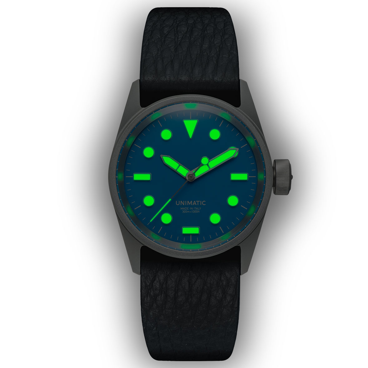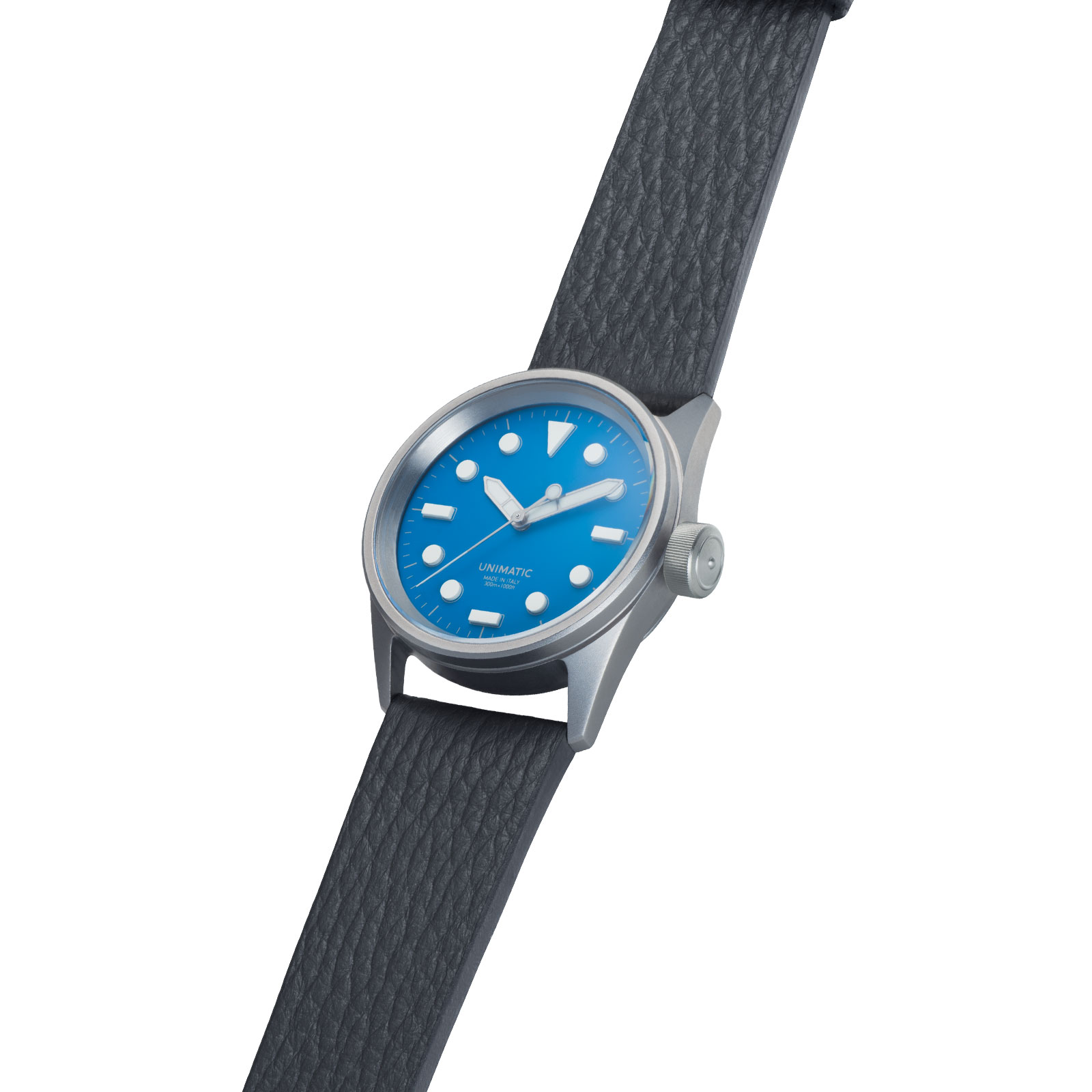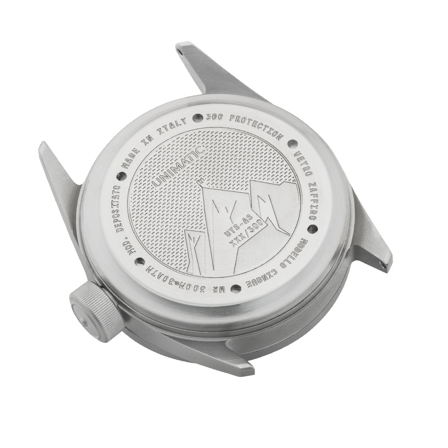 Il Modello Cinque da 36 mm è una interpretazione all-round di Unimatic: compatta, versatile e ricca di dettagli alpini. È disponibile in due splendide colorway: l'evocativo Alpine Sky Blue (ref. UT5-AS) e il puro Glacier White (ref. UT5-GO). Il quadrante presenta indici UNILIGHT 3D, eleganti finiture grigio scuro e le nostre distintive lancette phantom ladder in acciaio, con la punta del secondo in Super-LumiNova® C1.
