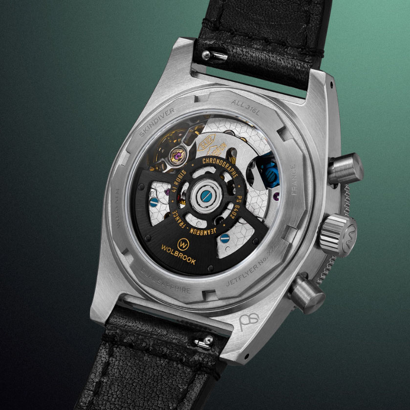 Il cuore pulsante dell'orologio è il movimento cronografico automatico Jeambrun PS 6402, un calibro di alta gamma dotato di ruota a colonne e frizione verticale, che assicura un'attivazione fluida e precisa della funzione crono. Il quadrante, protetto da un vetro zaffiro "Box" altamente resistente, presenta indici e lancette trattati con Super-LumiNova® BGW9, offrendo una leggibilità superiore e un bagliore azzurro intenso in condizioni di scarsa luminosità.
