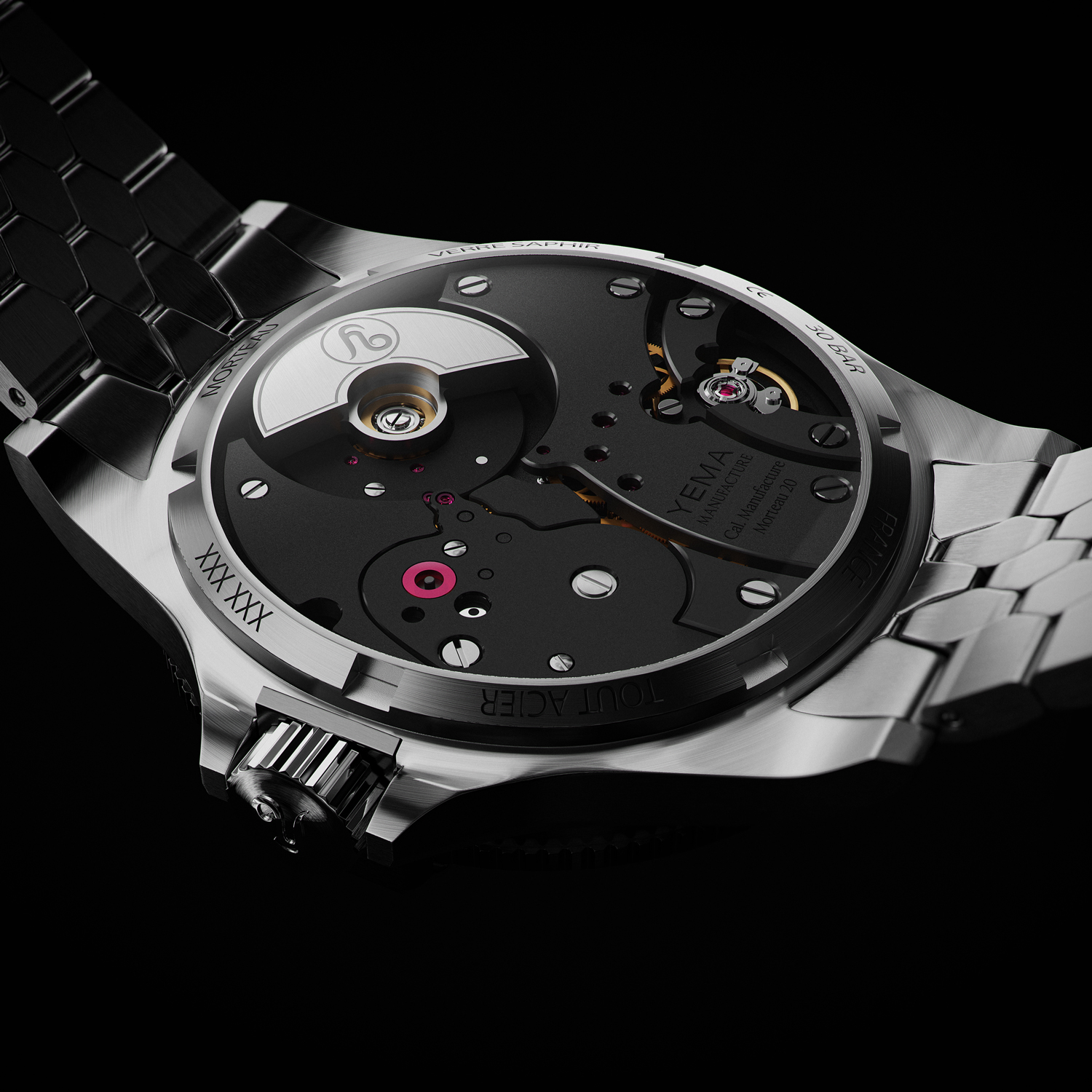 Un punto di riferimento luminescente, anch'esso trattato con Super-LumiNova C1 grado A, è posizionato a ore 12. La robustezza è rafforzata da un blocco meccanico della lunetta, un sistema brevettato dal 1967. La corona è a vite e reca in rilievo il logo YEMA, contribuendo all'eccezionale livello di impermeabilità di 30 BAR (300 metri / 990 piedi), rendendolo idoneo per immersioni professionali.