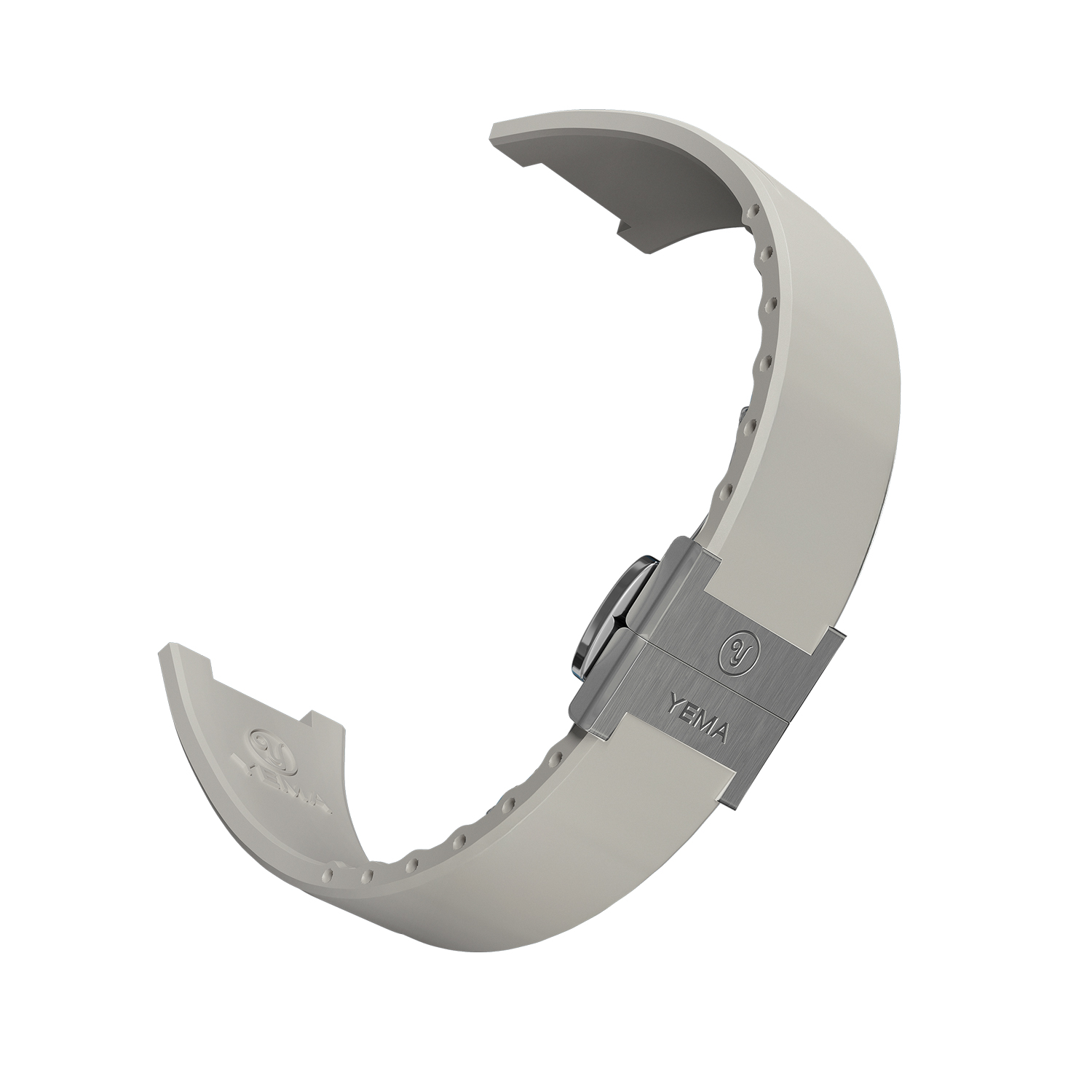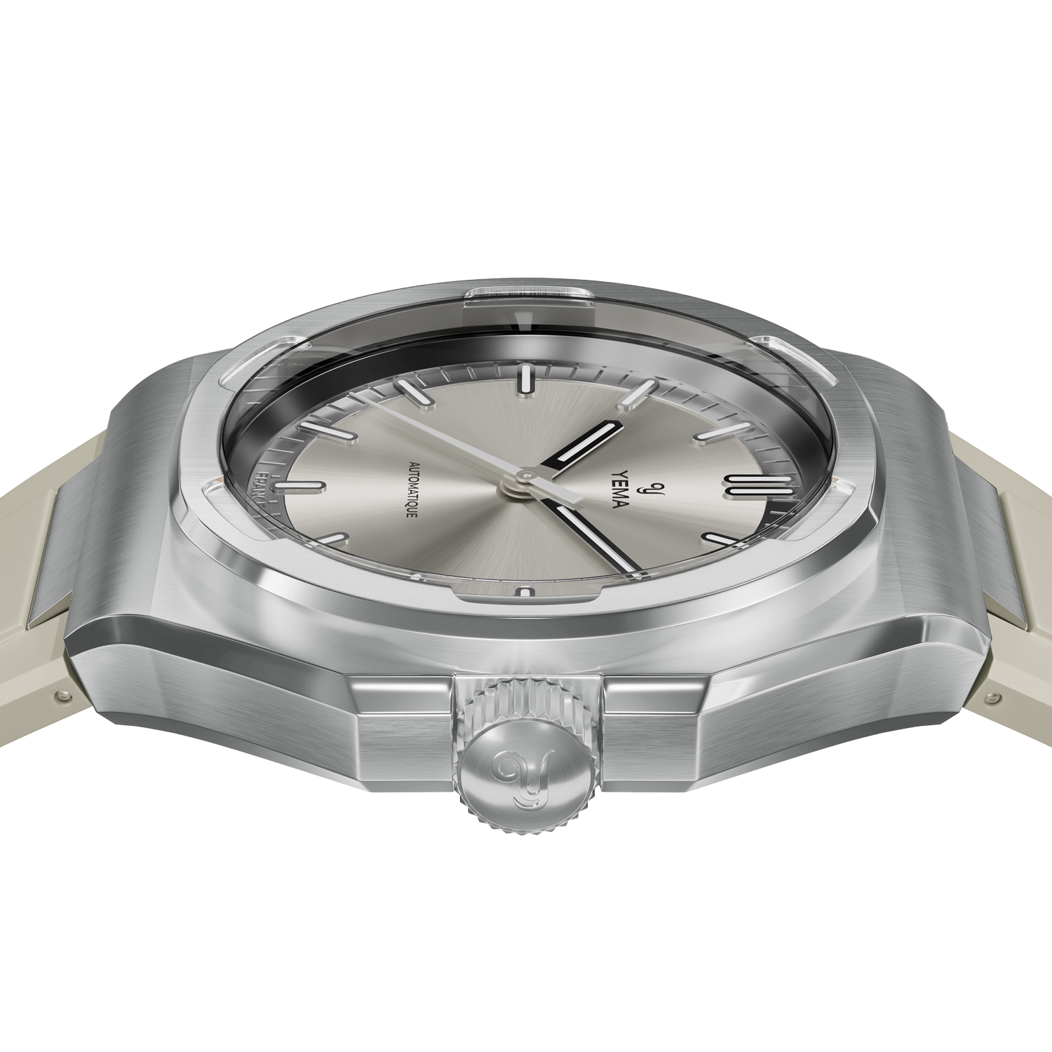 In alternativa, l'orologio include anche un cinturino integrato in gomma FKM per uno stile più sportivo e un comfort superiore. La corona è a spinta, con finitura spazzolata e il logo YEMA lucido in rilievo.