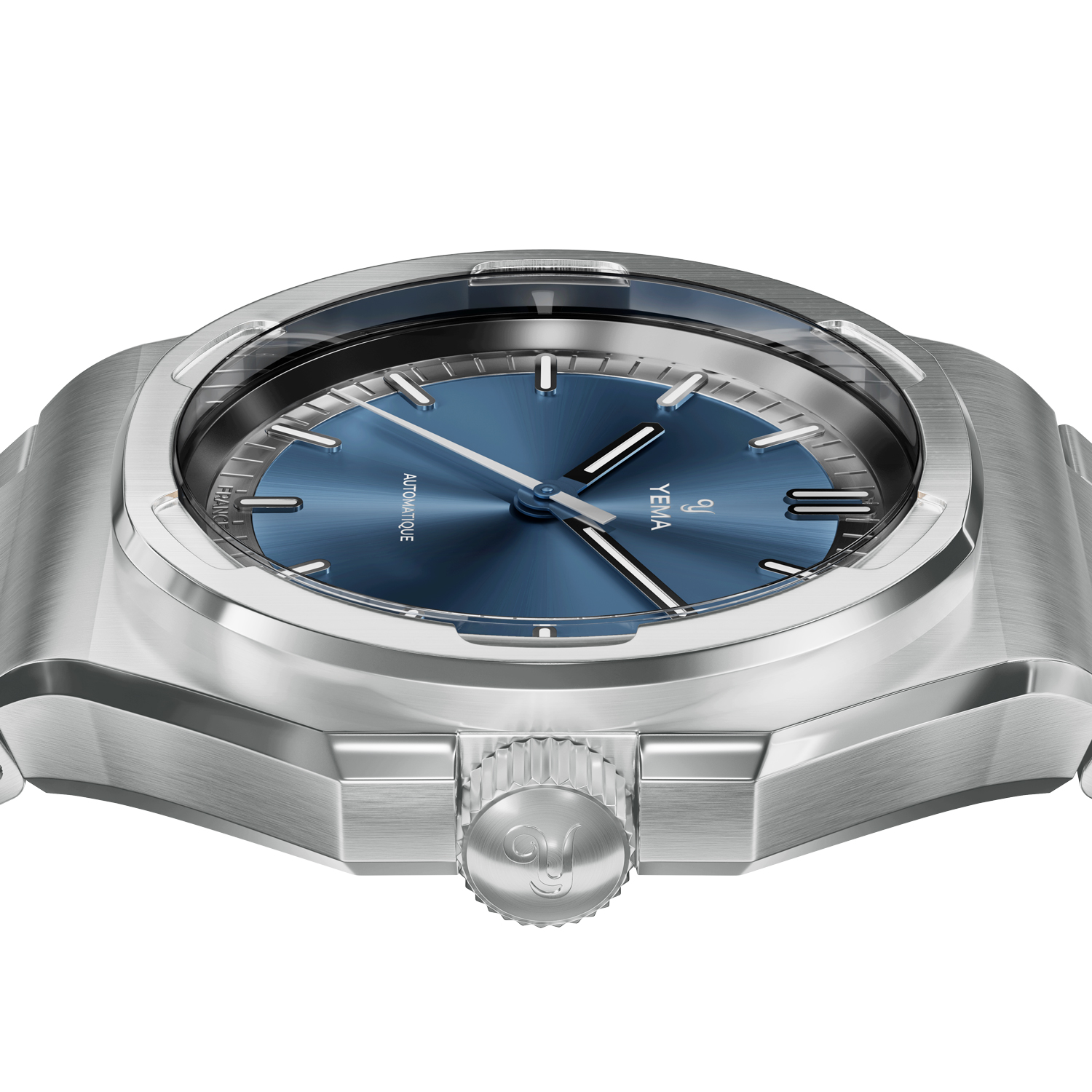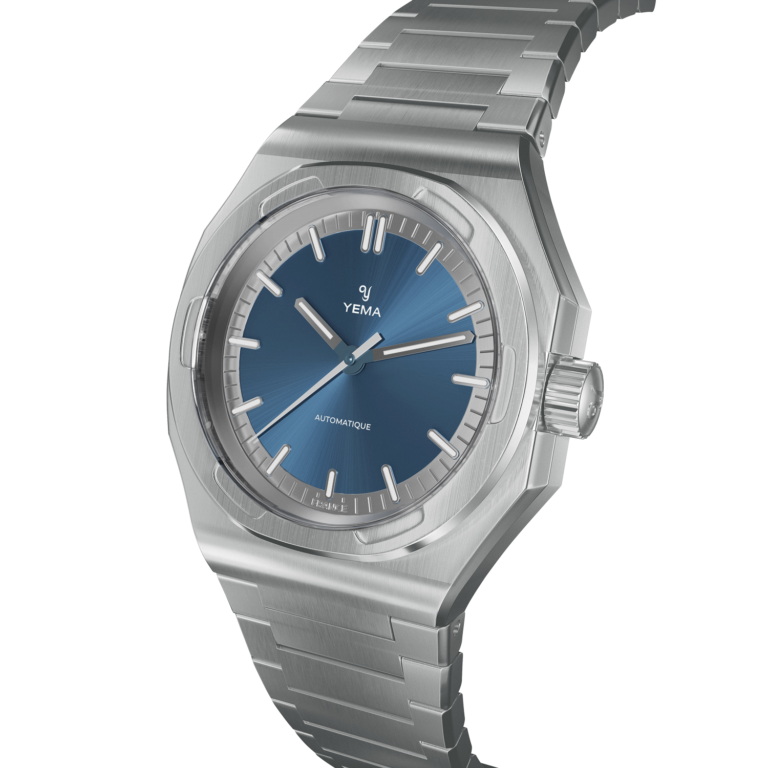 In alternativa, l'orologio include anche un cinturino integrato in gomma FKM per uno stile più sportivo e un comfort superiore. La corona è a spinta, con finitura spazzolata e il logo YEMA lucido in rilievo.
