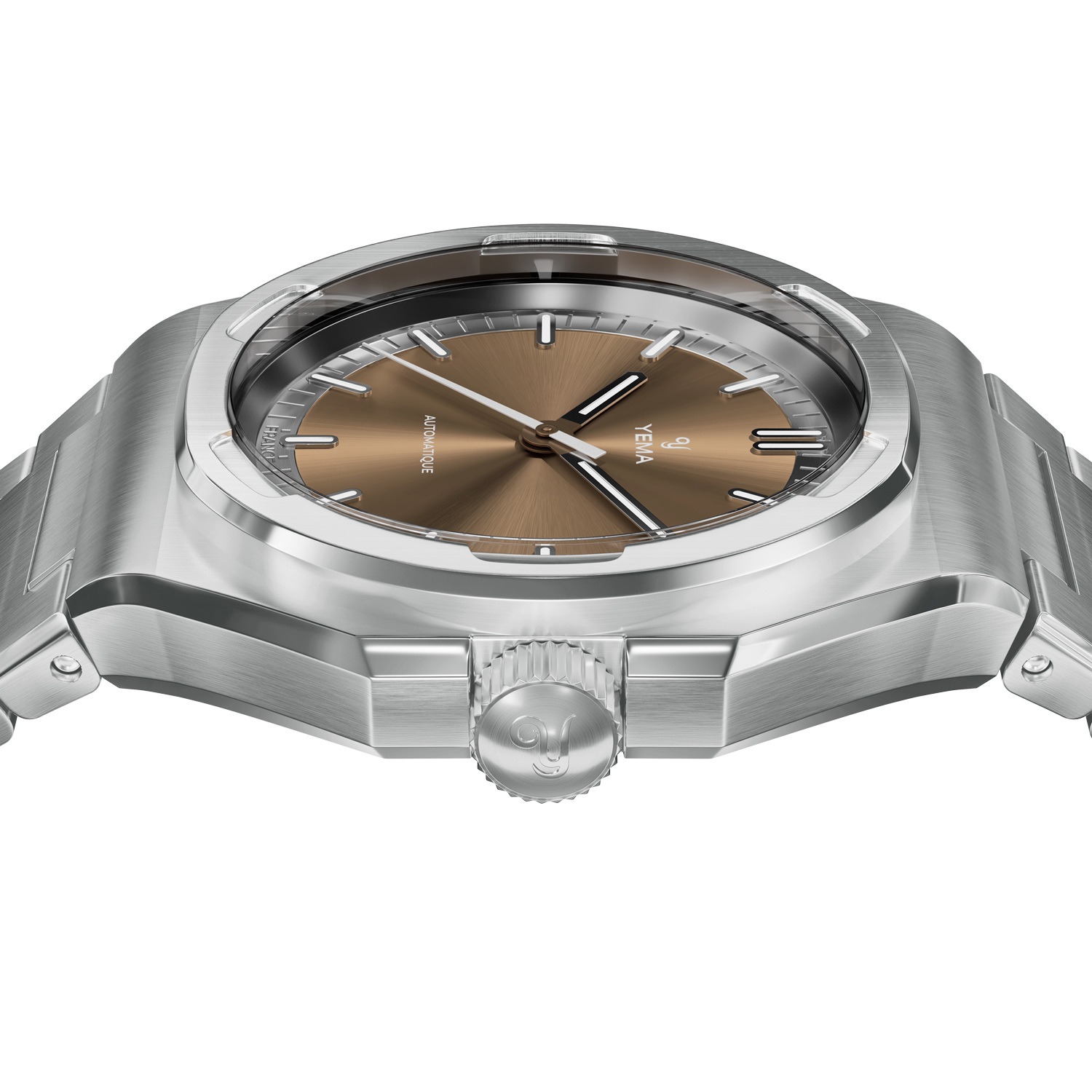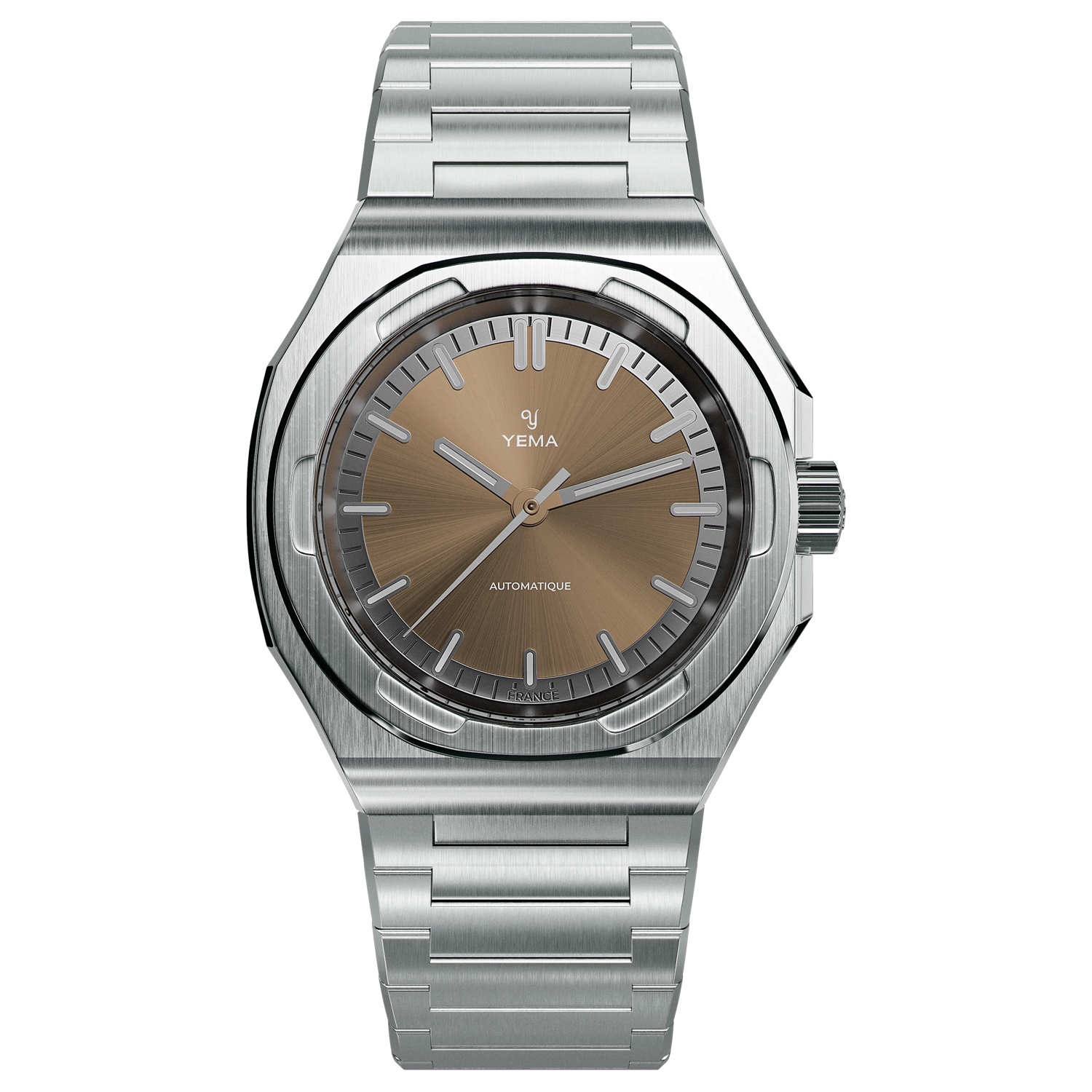 In alternativa, l'orologio include anche un cinturino integrato in gomma FKM per uno stile più sportivo e un comfort superiore. La corona è a spinta, con finitura spazzolata e il logo YEMA lucido in rilievo.