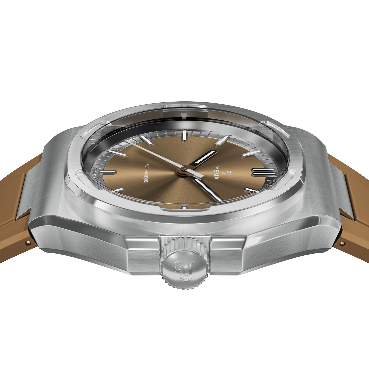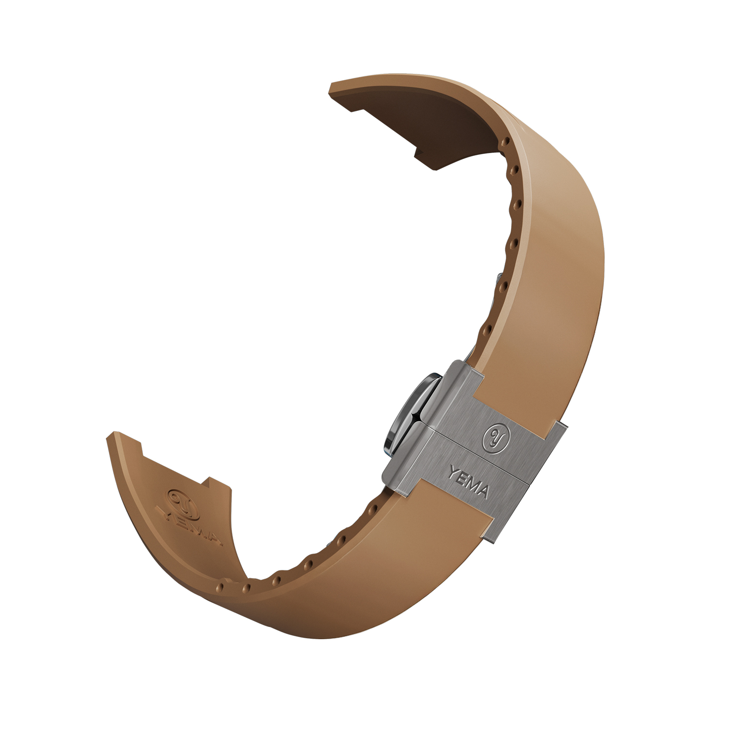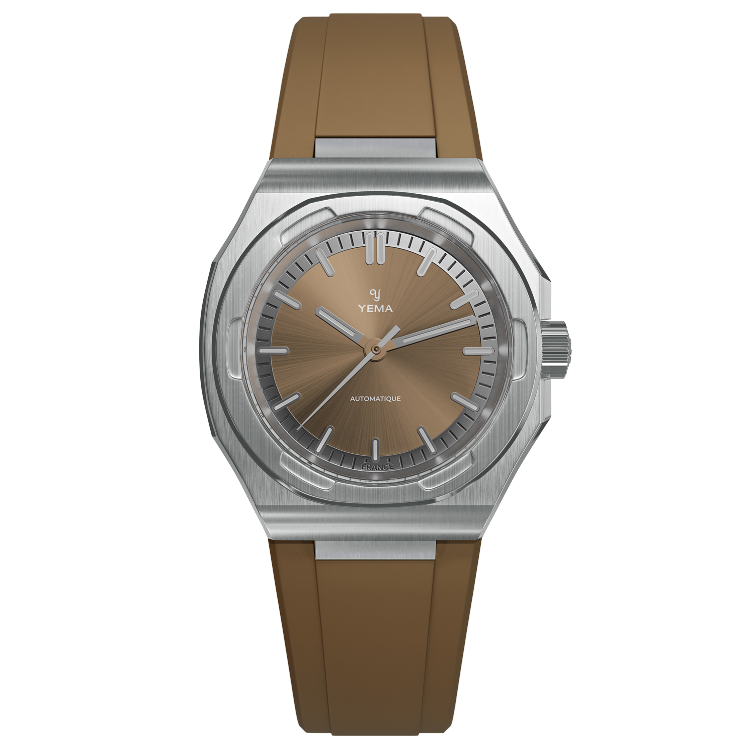 In alternativa, l'orologio include anche un cinturino integrato in gomma FKM per uno stile più sportivo e un comfort superiore. La corona è a spinta, con finitura spazzolata e il logo YEMA lucido in rilievo.